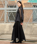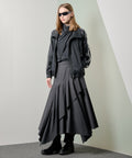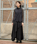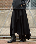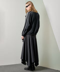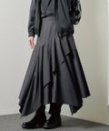 スカーフを巻きつけたようなアシンメトリーの構築的ラインが印象を残す、モード感漂うカーチーフマキシスカート。計算されたドレープが歩くたびに鋭く揺れ、スタイリングにエッジと立体感を与えます。軽やかで落ち感のある素材を採用し、ボリュームがありながらも重く見えないミニマルなシルエットに仕上げました。ウエストはクリーンにまとめ、タイトなトップスはもちろん、オーバーサイズニットやシャツとのスタイリングでもバランスよくモードに決まります。1枚持っているだけでコーデをアップデートする、存在感のあるアイテムです◎