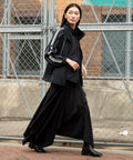 タイトなリブトップスを合わせれば、スカートの立体的なラインが際立ち、ミニマルで研ぎ澄まされたモードスタイルに。足元はスクエアトゥブーツやソールの厚いローファーで、重心を下に落とすと全体のバランスがさらに洗練されます。