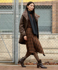 柔らかなハイゲージニットを合わせれば、女性らしさと上品さが共存するスタイルに。淡色トップスと合わせることでスカートの立体的なカッティングが際立ちます。足元はポインテッドトゥのパンプスやすっきりしたブーツで、クリーンにまとめるのがおすすめ。